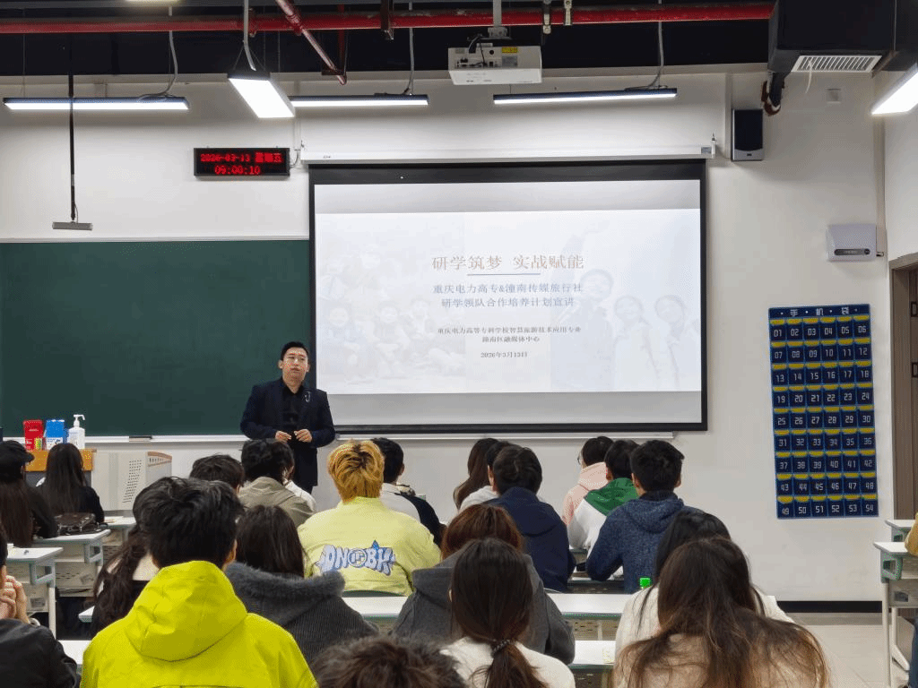 为深入贯彻落实校地研学合作共识,抢抓3-5月研学旅游旺季机遇,3月13日,潼南区融媒体中心所属潼南传媒有限公司研学部一行7人走进重庆电力高等专科学校,面向2024级智慧旅游技术应用专业73名学生开展潼南研学项目专场宣讲会。旅游专业4名专任教师共同参与活动。